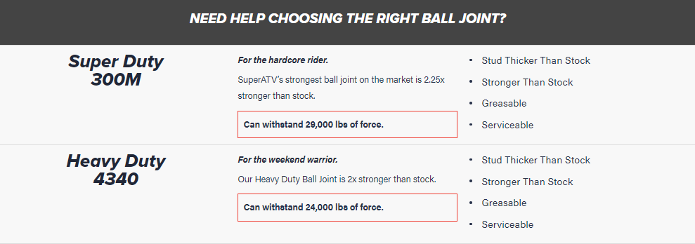 SuperATV put the strongest stud material on the planet into your Super-Duty Ball Joints—hardened and black oxide coated 300M steel. It puts stock materials to shame, and combined with a design that doesn’t neck down as much as stock, you get a ball joint that’s 2.25x stronger than OEM. It’s built for riders that like to keep their foot down and don’t compromise.